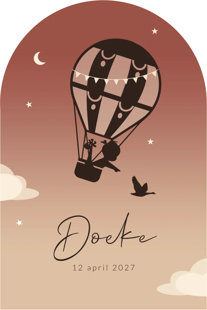Geboortekaartje met een ronde vorm aan de bovenkant. Een meisje in een luchtballon kijkt naar de wereld om haar heen. Sfeervol door het kleurverloop op de achtergrond. Dit kaartje is er ook voor een jongetje.