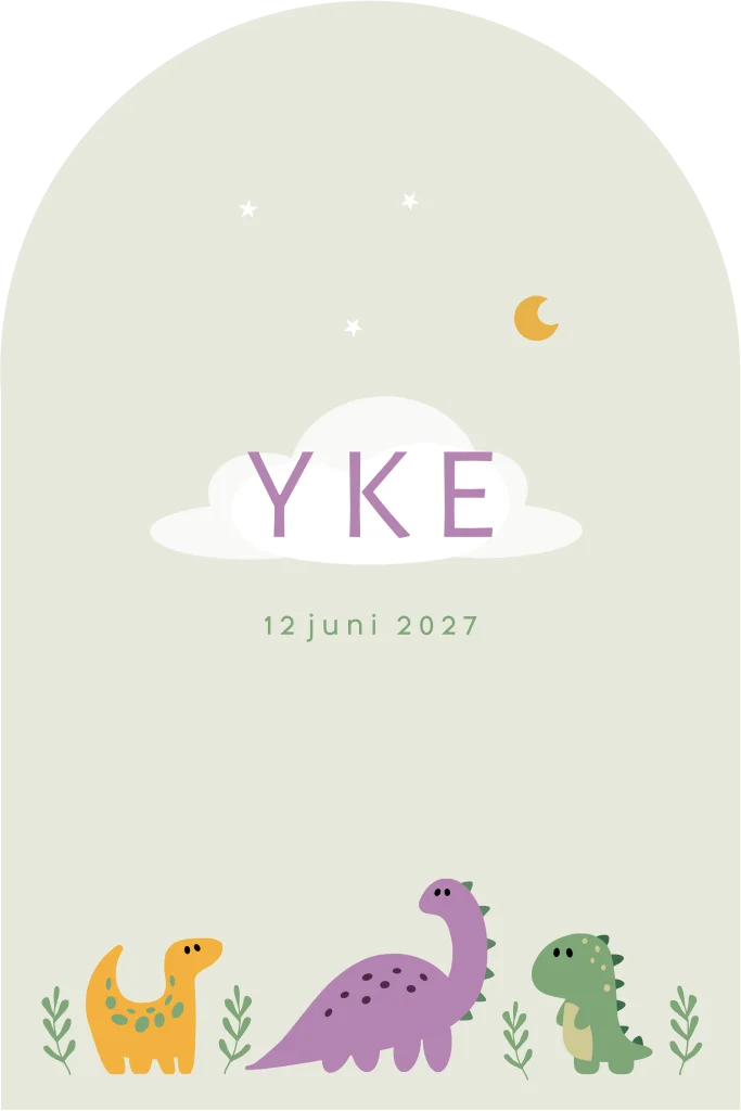 Enkel geboortekaartje met een parade van lieve dino's. In de wolk in de lucht staat de naam van het kindje.