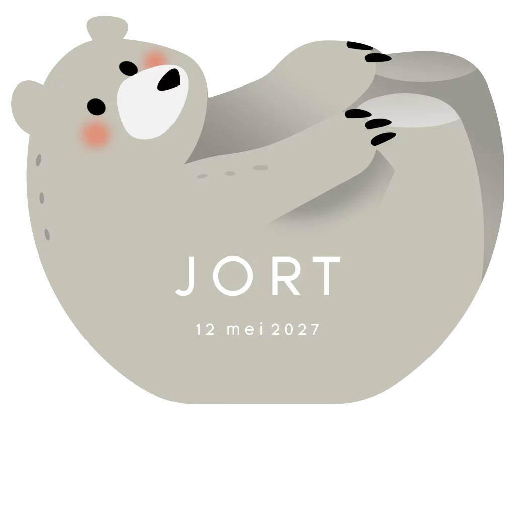 Uniek geboortekaartje in de vorm van een beer die op zijn rug met zijn voeten aan het spelen is.