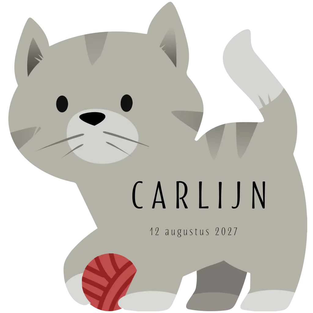 Uniek geboortekaartje in de vorm van een lieve grijze kat.