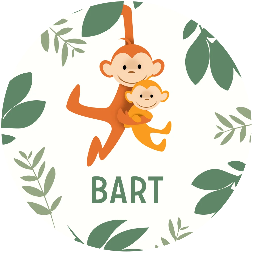 Vrolijk illustratief geboortekaartjes met een groot en een klein aapje die aan een blad hangen. Leuk voor als je een tweede kindje krijgt!