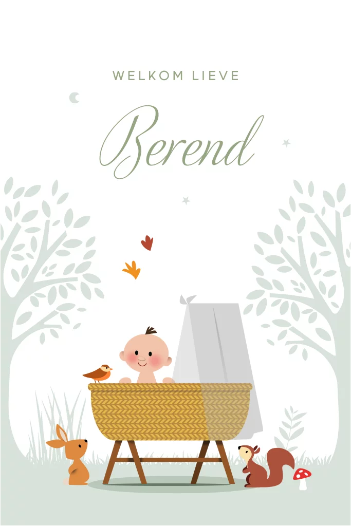 Enkel geboortekaartje waarop je een jongetje ziet in een wieg. Om hem heen zie je een konijntje, eeneekhoorn, paddestoel, vallende bladeren. Het kaartje straalt hierdoor een herfstachtige sfeer uit.