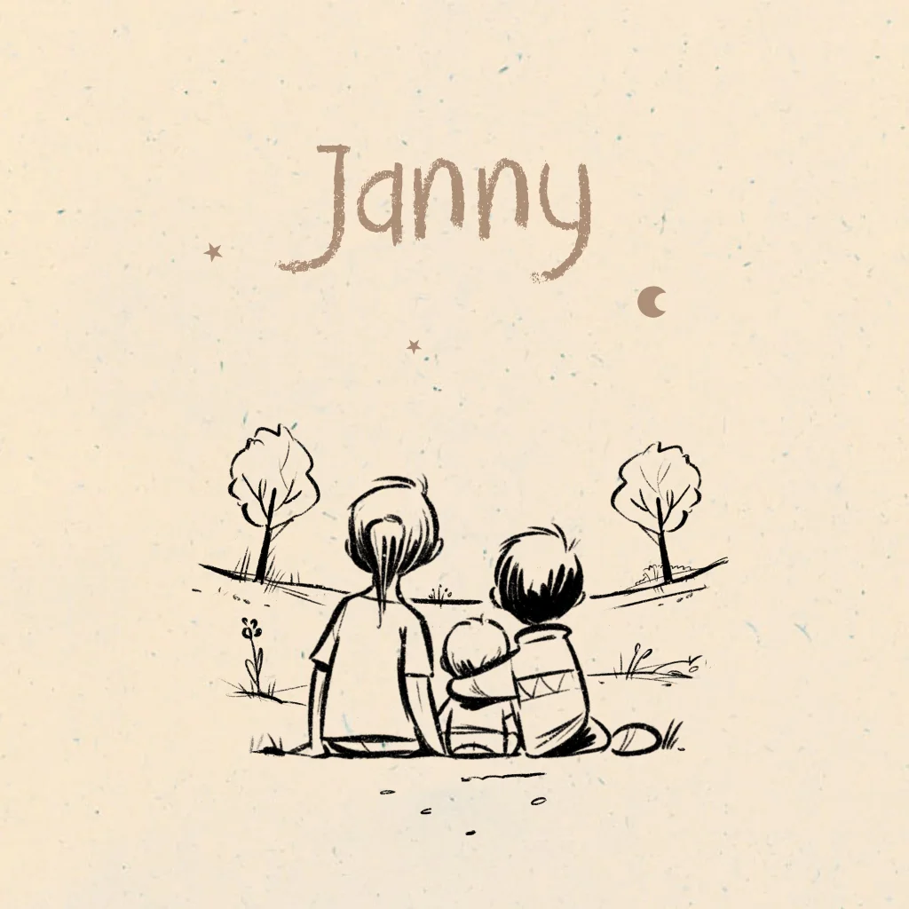 Geboortekaartje met in lijntekening drie kinderen die naar de maan en sterren in de lucht kijken.