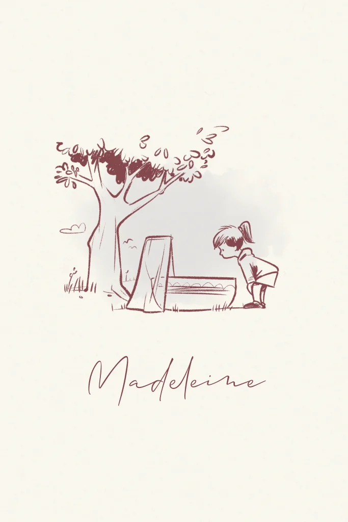 Mooi eenvoudig geboortekaartje met lijntekening waarop een wiegje in het gras bij een boom staat. Een meisje kijkt in de wieg.