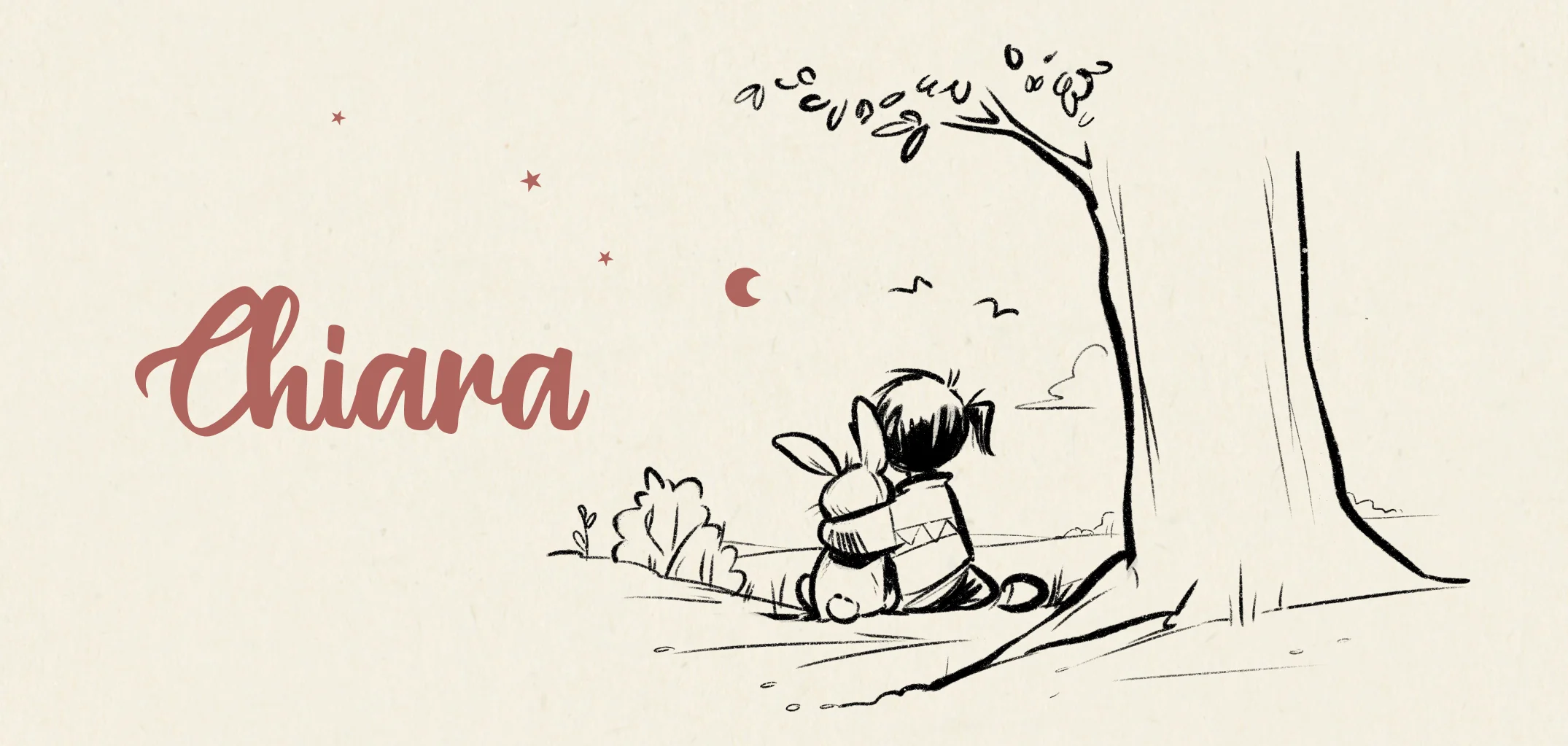 Geboortekaartje met een meisje en een konijn die onder een boom zitten.