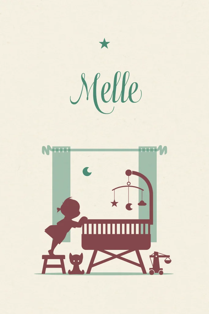Geboortekaartje gedrukt op duurzaam papier. een meisje staat op een krukje en kijkt over het randje van de wieg. Speelgoed staat op de grond. De wieg staat voor een raam waar de maan door naar binnen schijnt.