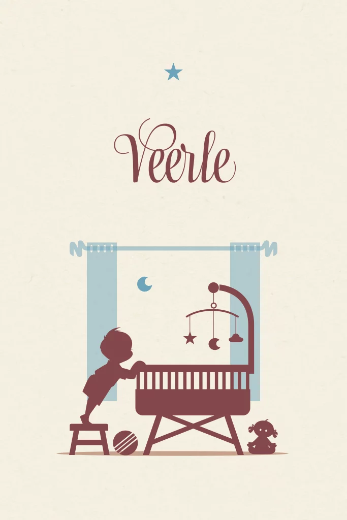 Geboortekaartje op duurzaam papier. Een jongetje kijkt over het randje van de wieg naar de baby die in de wieg ligt.