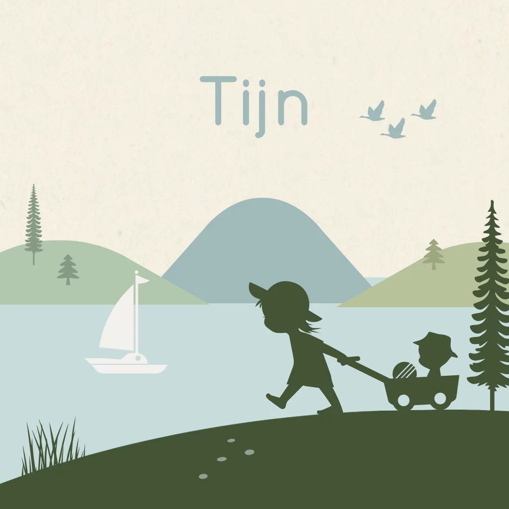 Geboortekaartje twee kinderen landschap zeilboot meer silhouet