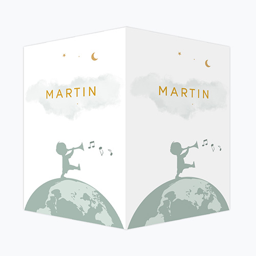 Silhouet van een stoer jongetje dat op een wereldbol loopt terwijl hij op een trompet speelt. Dit makelaarsbord kan gemakkelijk bewerkt worden in onze online editor. Je maakt één zijde op in de editor en dit wordt vervolgens op twee zijdes gedrukt.