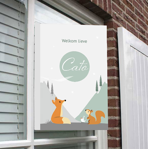 Raambord met een vos, een eekhoorn en een vogeltje die naar de lucht kijken waar een naam in de lucht geschreven staat.
