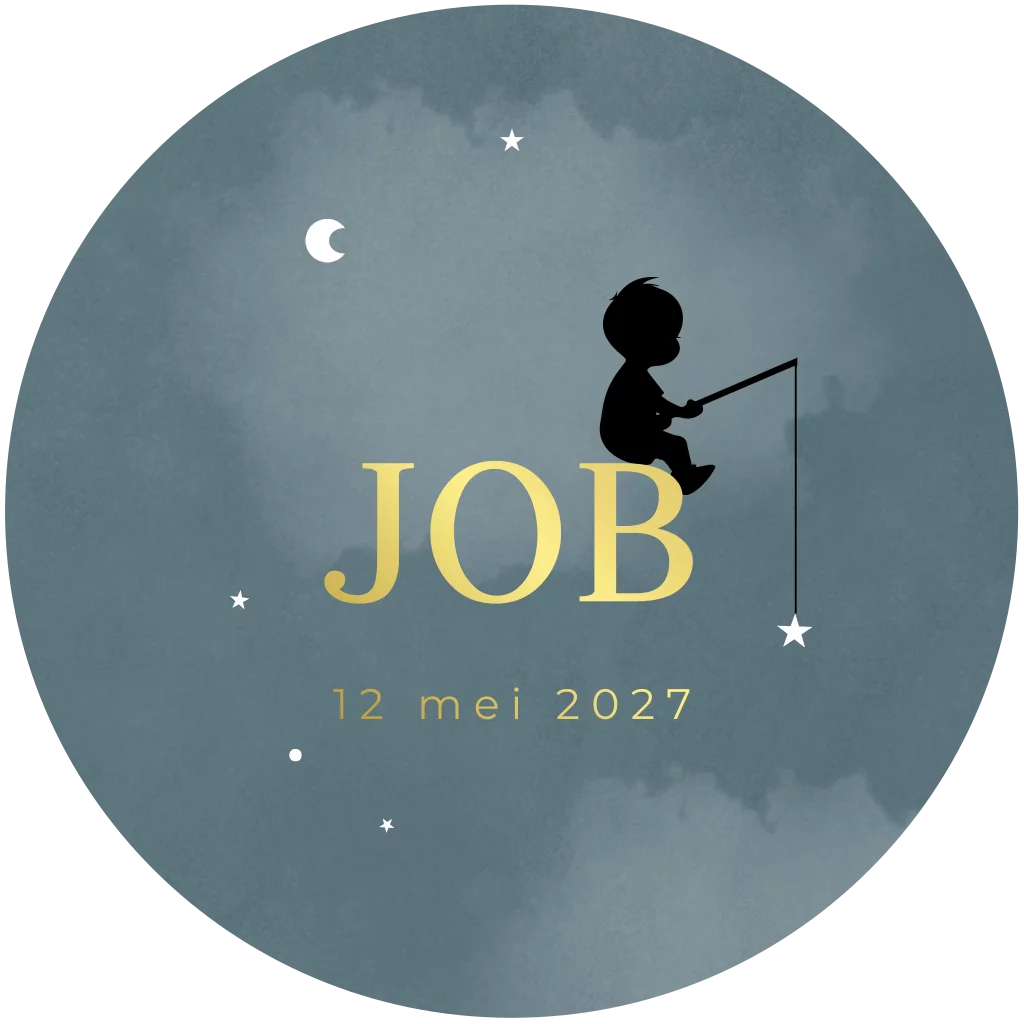 Geboortekaartje in een ronde vorm met het silhouet van een jongetje dat naar een sterretje hengelt. Met naam in goudfolie.