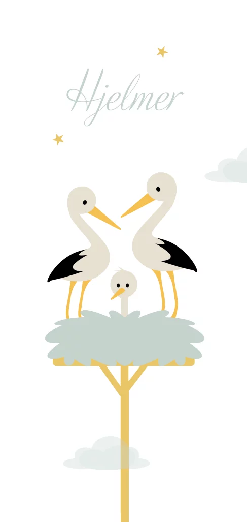 Geboortekaartje waarop drie ooievaars in een nest zitten.