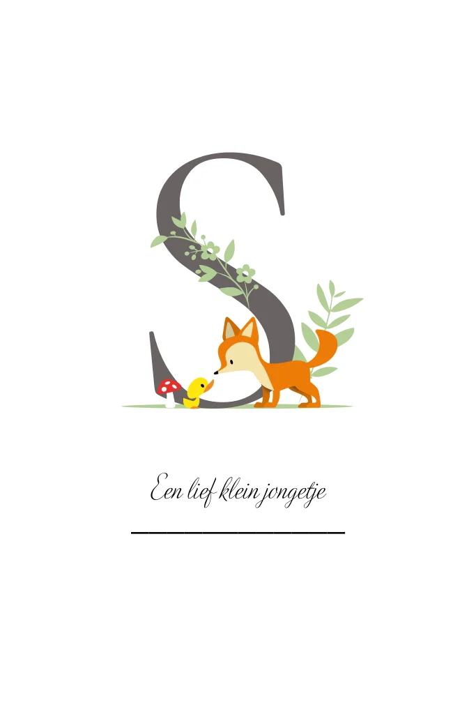 Geboortekaartje met een grote letter en een vosje dat oog in oog staat met een klein eendje. De naam is in zilverfolie gedrukt.