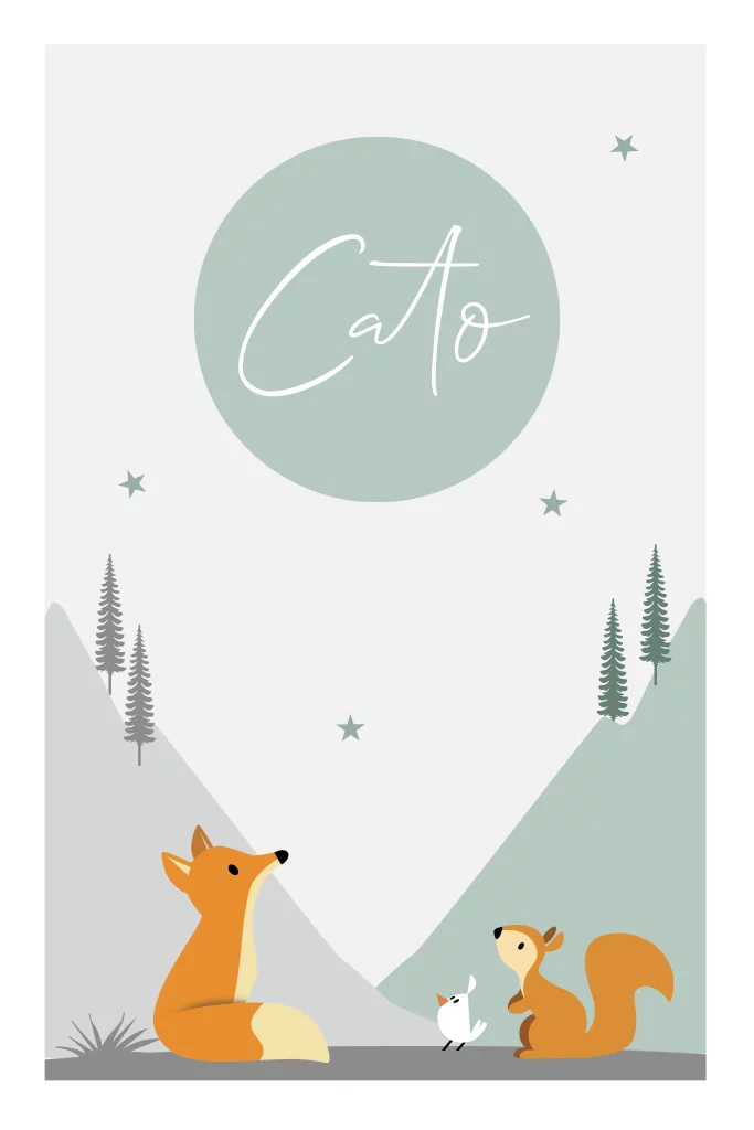 Geboortekaartje met een vos, een eekhoorn en een vogeltje die naar de lucht kijken waar een naam in de lucht geschreven staat.