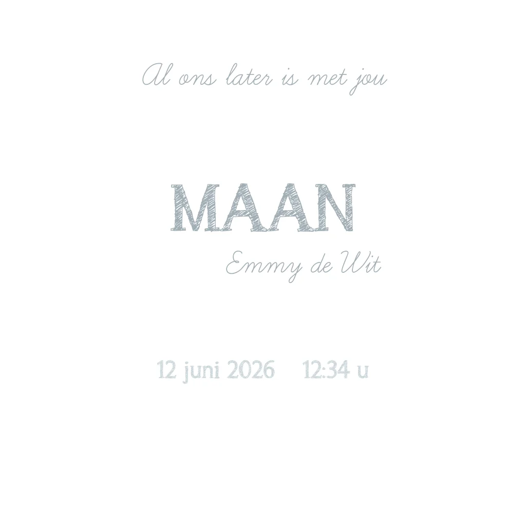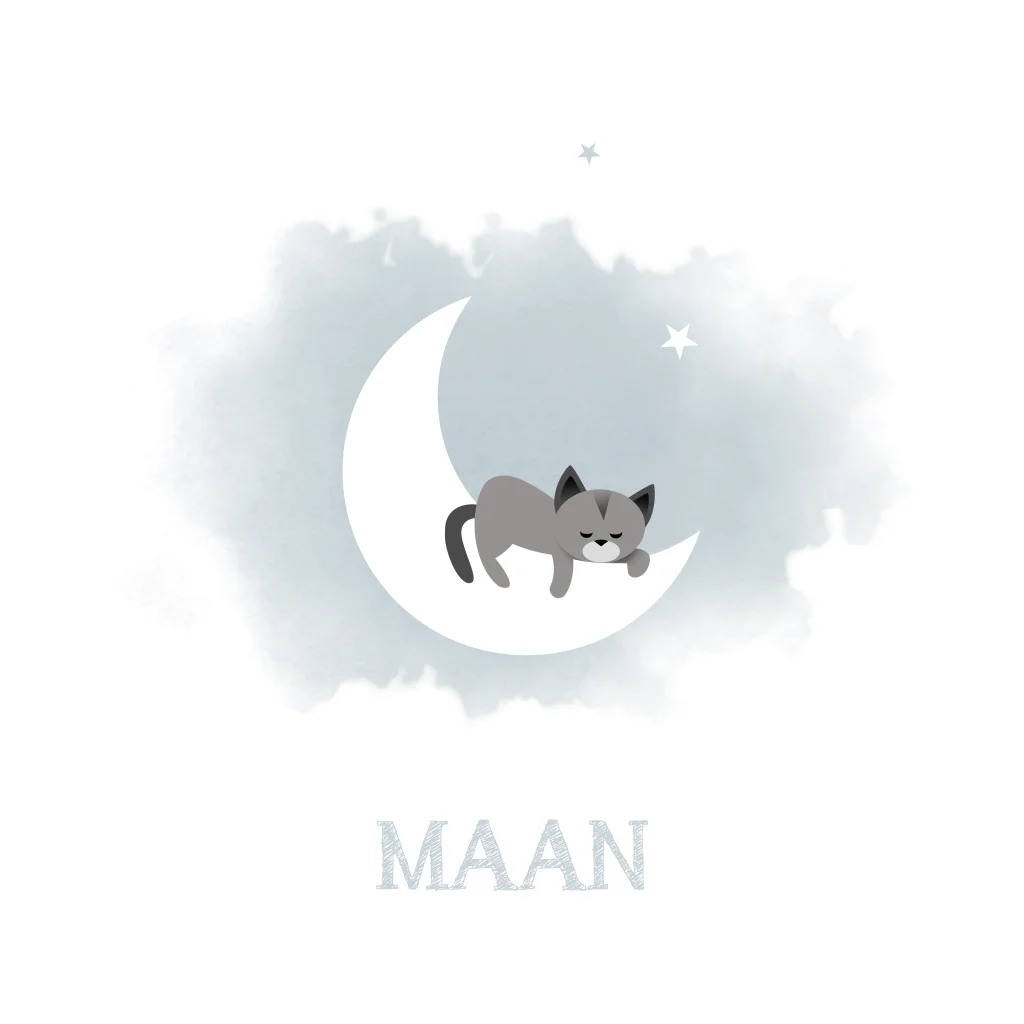 Geboortekaartje waarop een kat op de maan ligt te slapen.