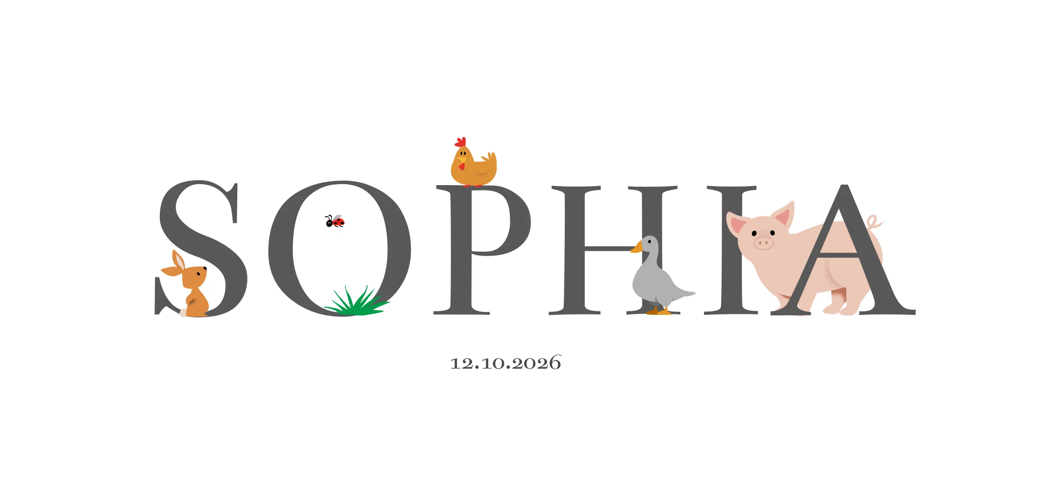 Geboortekaartje met letters en boerderijdieren. Een varken, gans, konijn en kip zitten en staan op of voor de naam van het pasgeboren kindje.