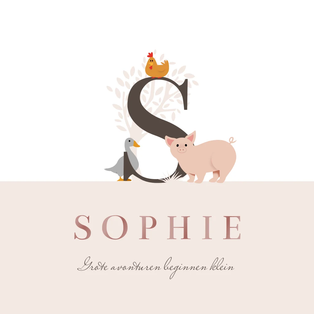 Typografisch geboortekaartje waarop een grote letter met daar omheen boerderijdieren. De naam van het kindje is in hoogglans gedrukt.