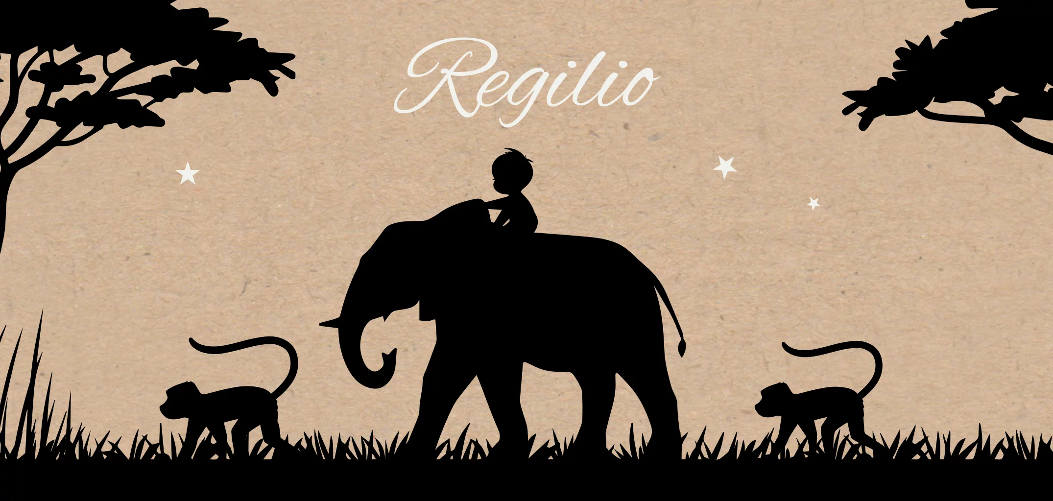 Geboortekaartje met een jongen die op de rug van een olifant zit. Twee apen lopen mee. Ook een giraf is zichtbaar.