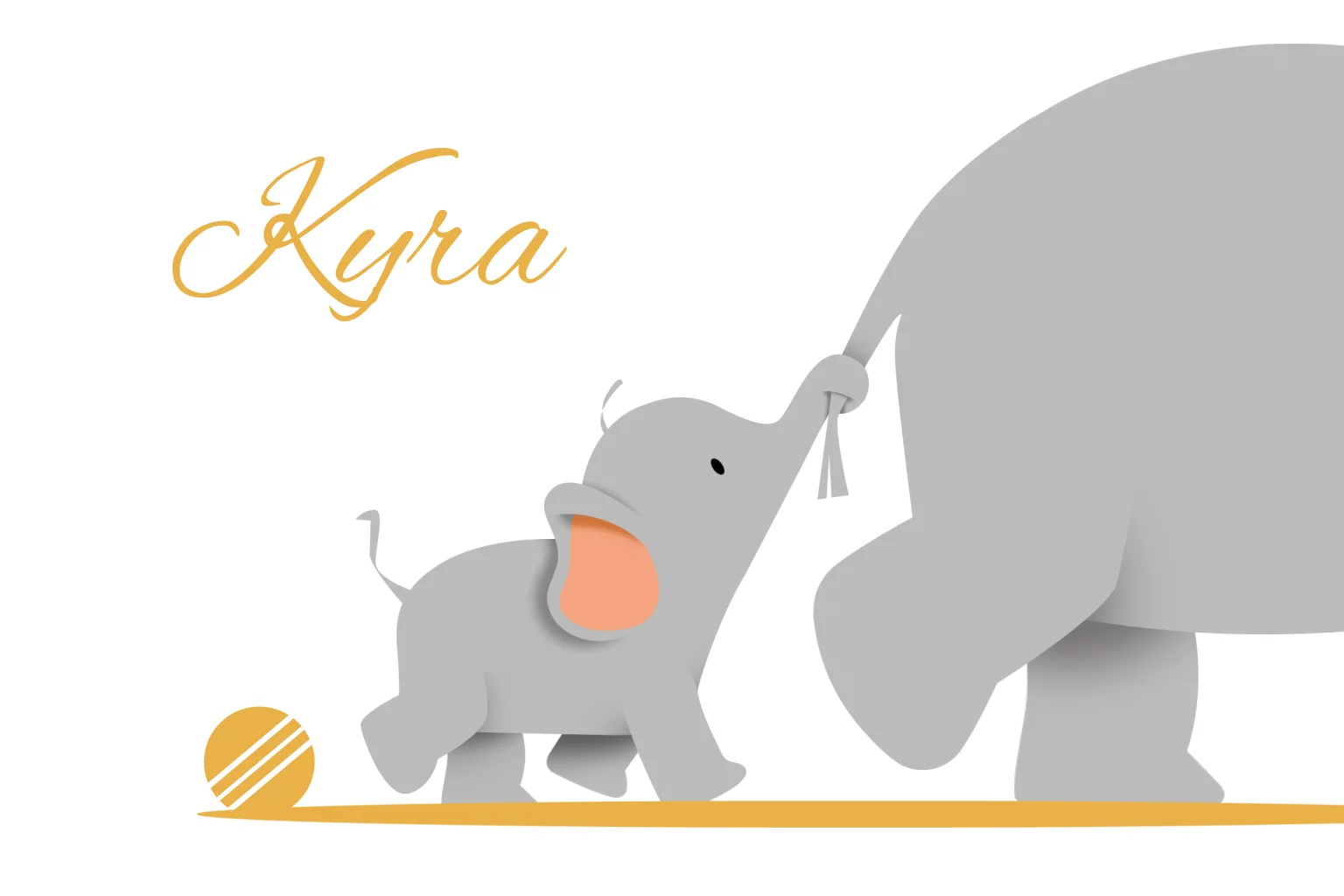 Geboortekaartje waarop een kleine olifant achter een grote olifant aanloopt.