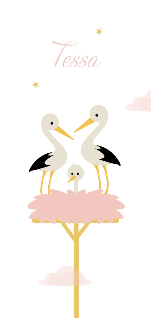Geboortekaartje met een kleine ooievaar die in een nest tussen zijn papa en mama zit.