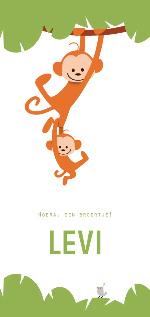 Geboortekaartje waarop zichtbaar twee aapjes die aan een tak hangen.