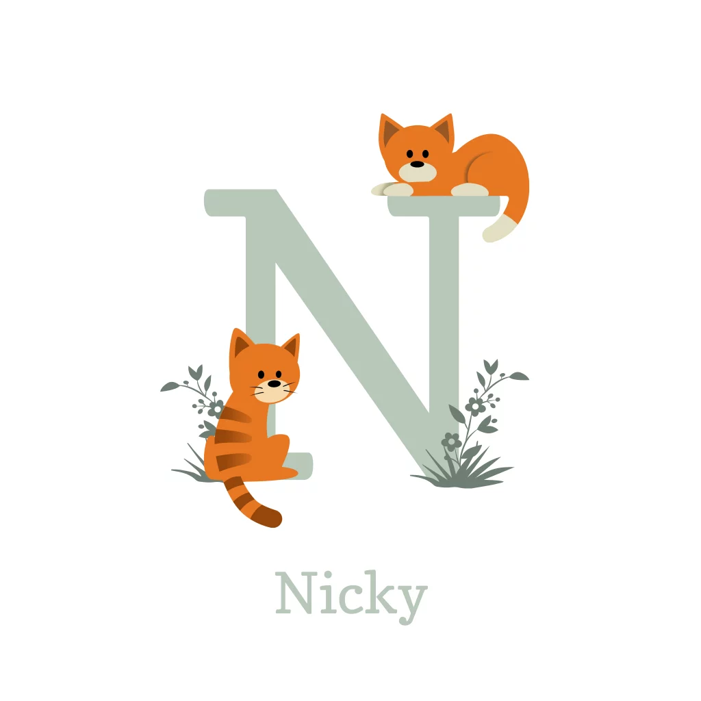Geboortekaartje met twee katten die bij een grote letter zitten, de eerste letter van de naam van het pasgeboren kindje.