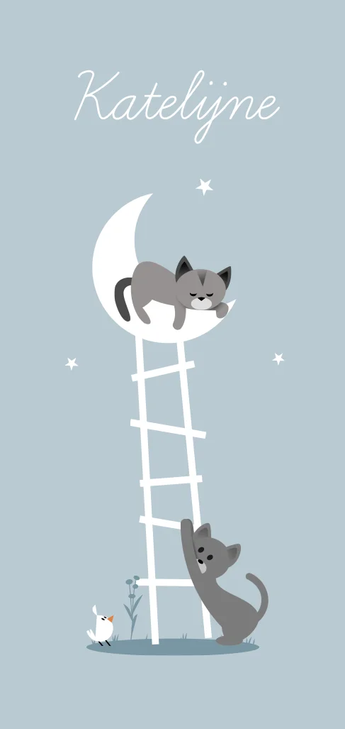 Geboortekaartje met twee katten. De ene ligt te slapen op de maan en de andere wil een ladder naar de maan beklimmen.
