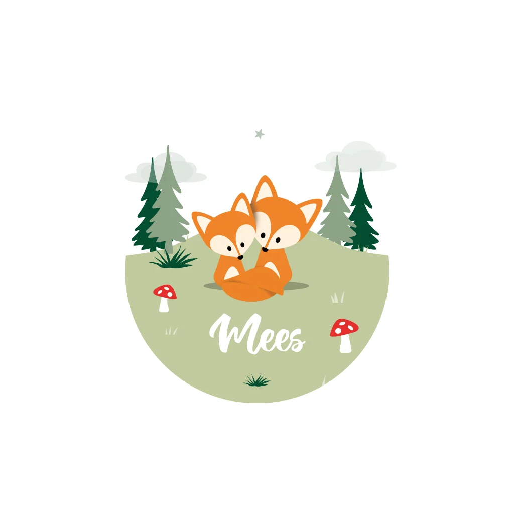 Een geboortekaartje met een grote en een kleiner vosje in een herfstachtig landschap.