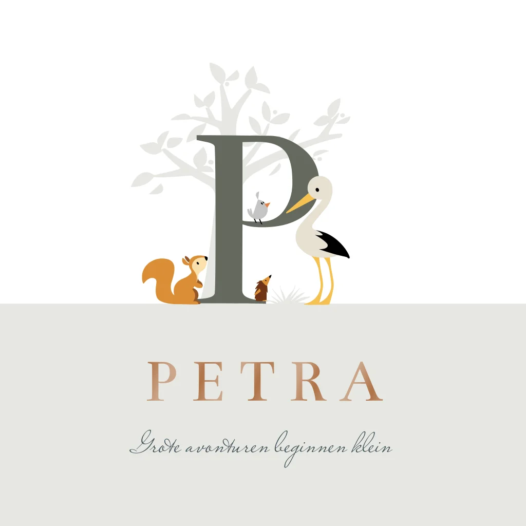 Vierkant typografisch geboortekaartje met hoogglans elementen en verschillende dieren, zoals een ooievaar, eekhoorn, egel en vogeltje.