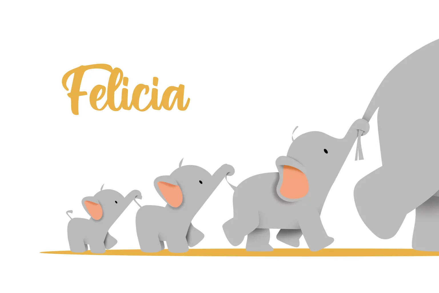 Geboortekaartje voor een derde kindje. Drie kleine olifanten lopen een grote moeder olifant achterna.