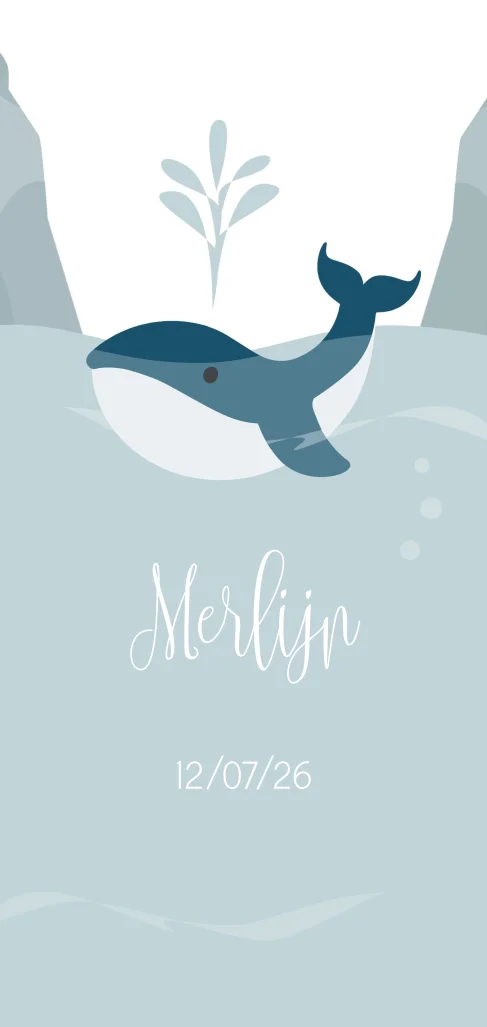 Geboortekaartje waarop een walvis in de golven aan het zwemmen is.