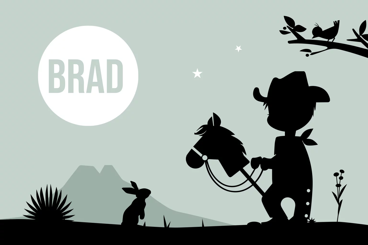 Geboortekaartje waarop je in silhouet een cowboy ziet die zijn stokpaardje vastheeft. Aan de binnenkant is een tipi en paard zichtbaar.