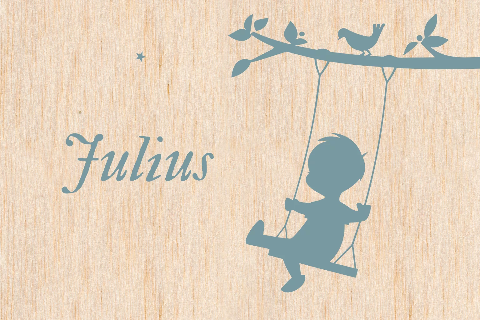Geboortekaartje op hout. Een silhouet van een jongetje, schommelend op een tak.