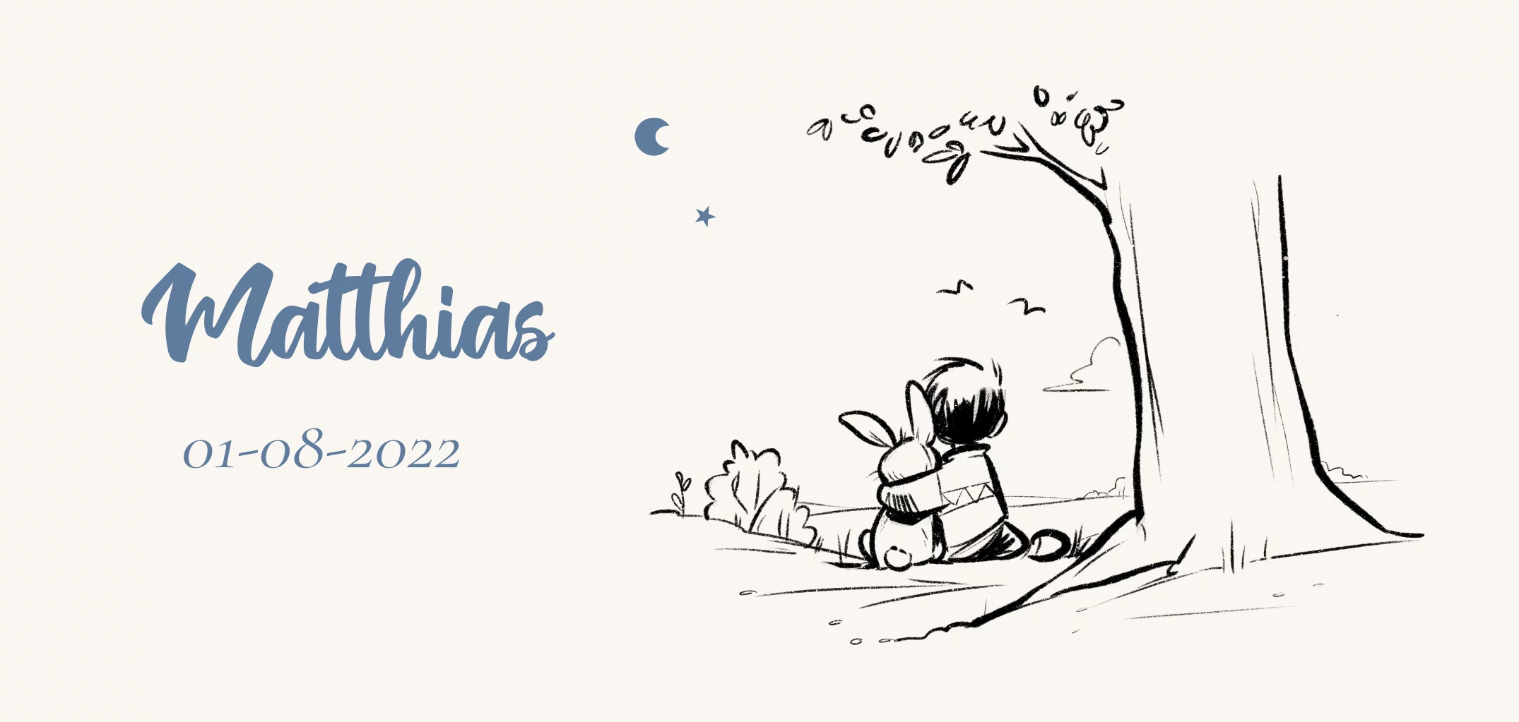 Geboortekaartje met een jongetje dat samen met zijn konijn aan de voet van een boom zit.