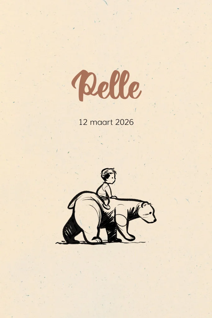 Geboortekaartje lijntekening. Een jongen zit op een beer.