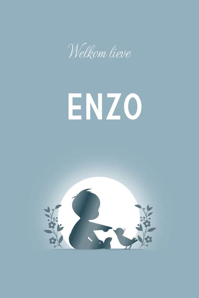 Geboortekaartje met het silhouet van een jongetje dat naar een vogeltje wijst. In blauwgrijze tinten.