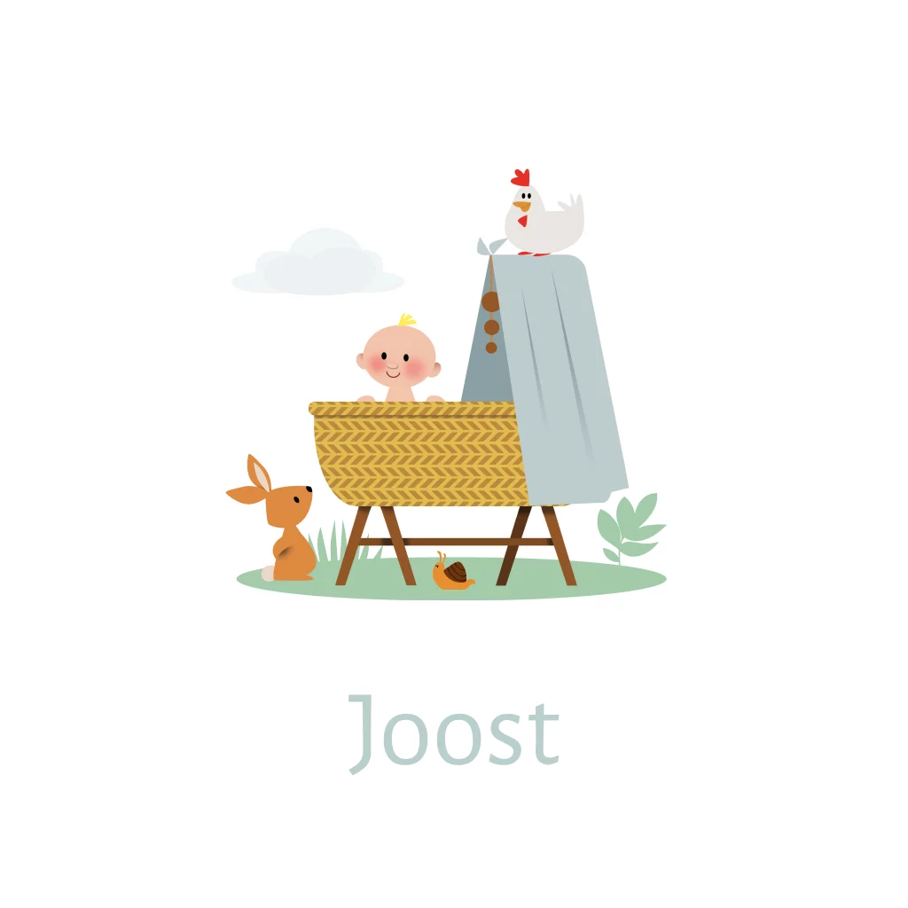 Geboortekaartje waarop een jongetje over de rand van de wieg kijkt. Een kip en konijn staan ook op het plaatje.