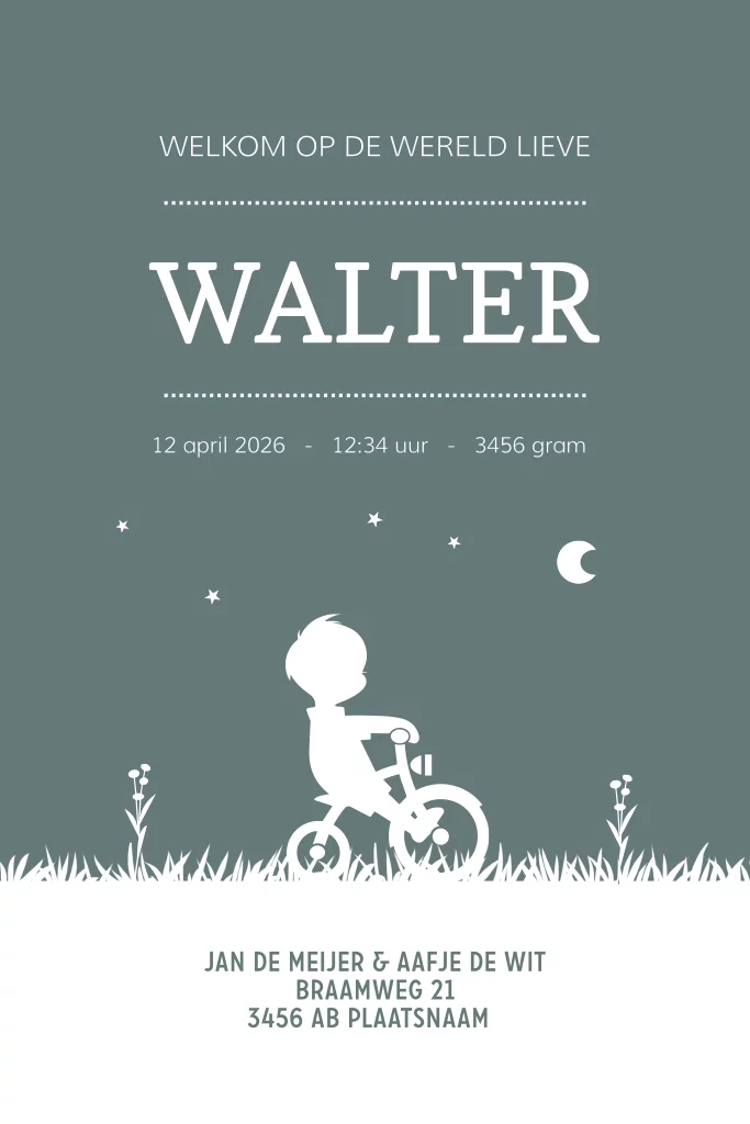 Geboortekaartje op echt karton. Een jongetje fietst door het gras. Naam, sterren en de naam zijn zichtbaar in de lucht.