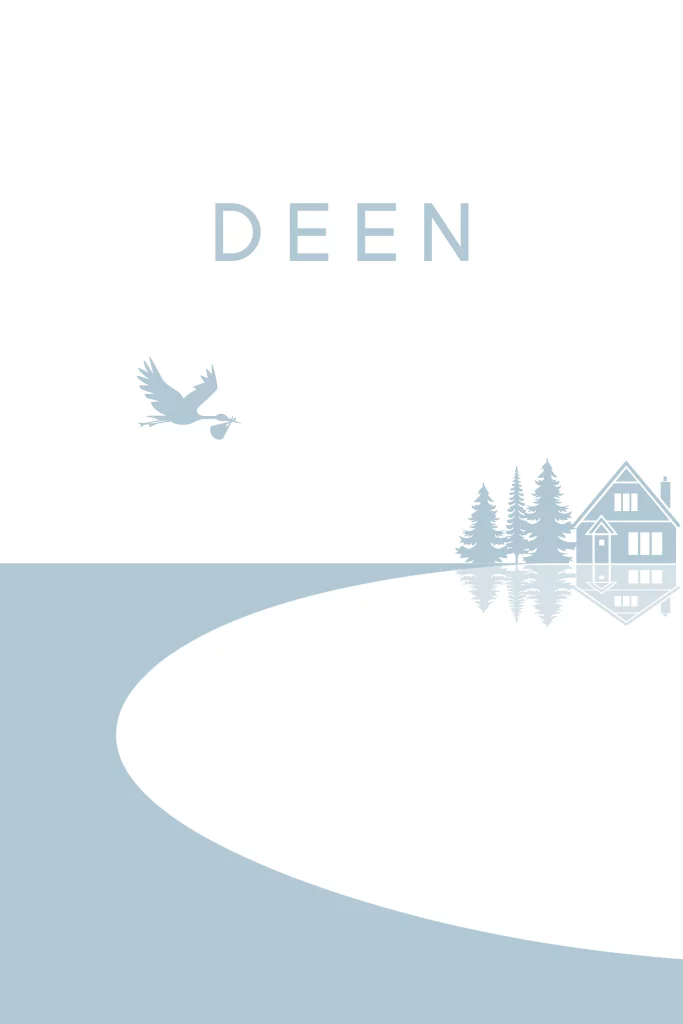 Gestyleerd geboortekaartje waarop een ooievaar in de lucht en een abstract landschap met meer, huis en bomen.