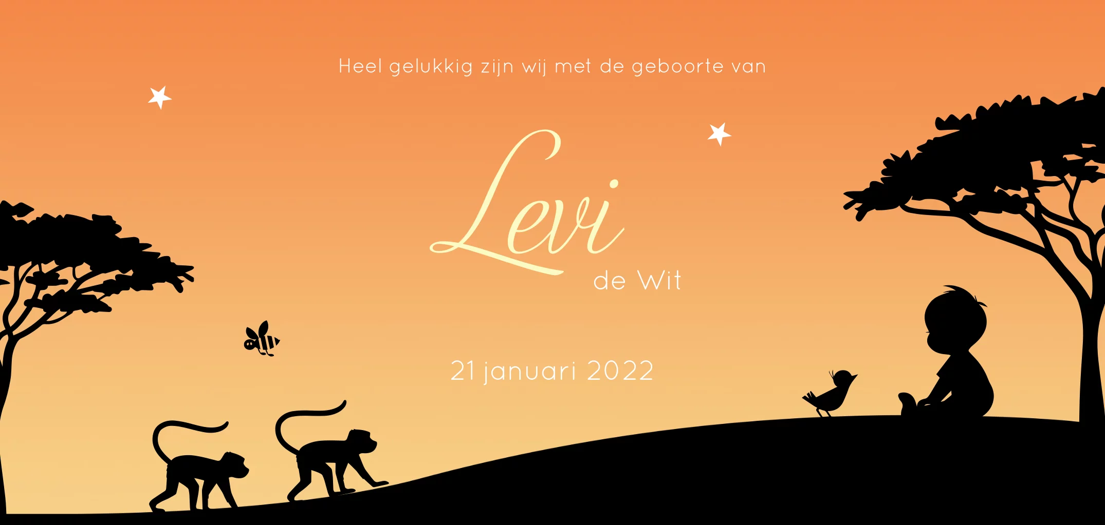 Geboortekaartje waarop een jongen gezeten op een leeuw. Je ziet olifanten, apen, een neushoorn en een impala.