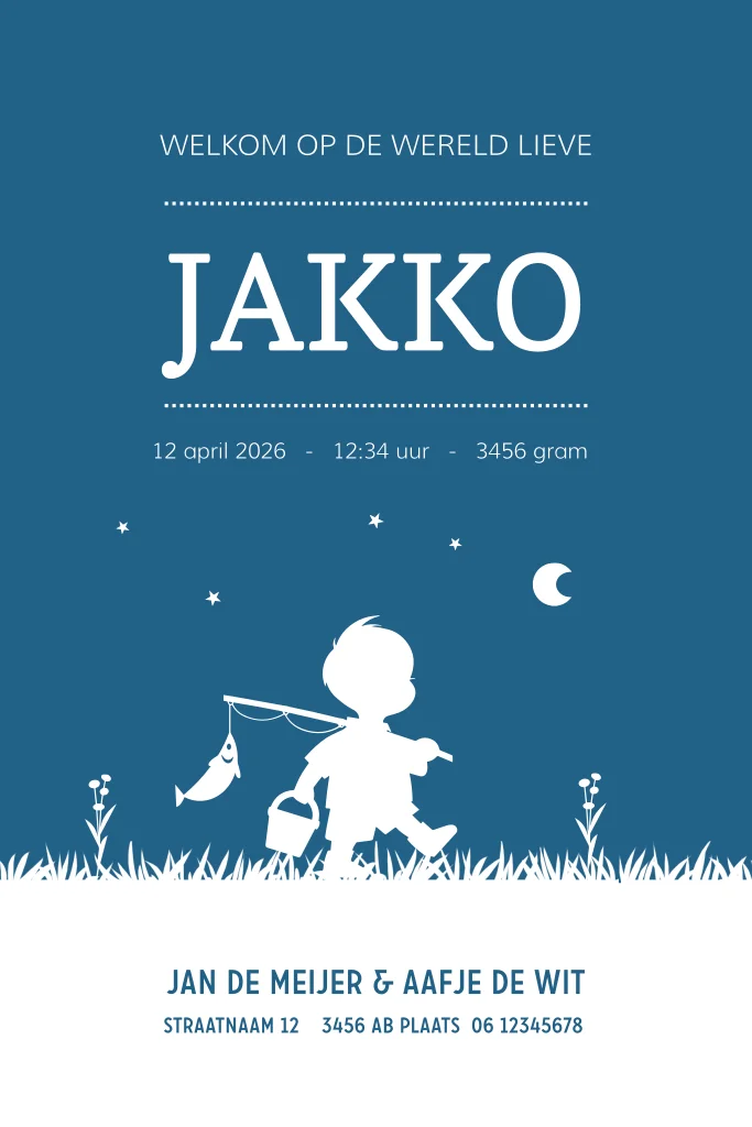Stoer geboortekaartje met silhouet van jongetje met hengel en emmertje. Extra mooi op karton