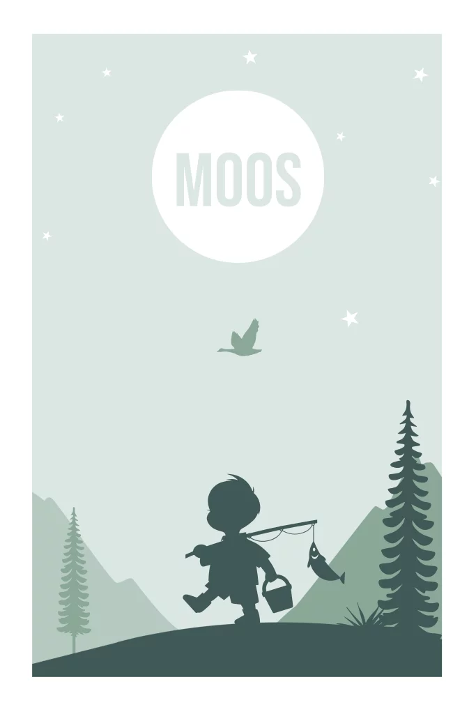 Geboortekaartje waarop je een jongetje ziet dat met zijn hengel door een heuvelachtig landschap loopt.