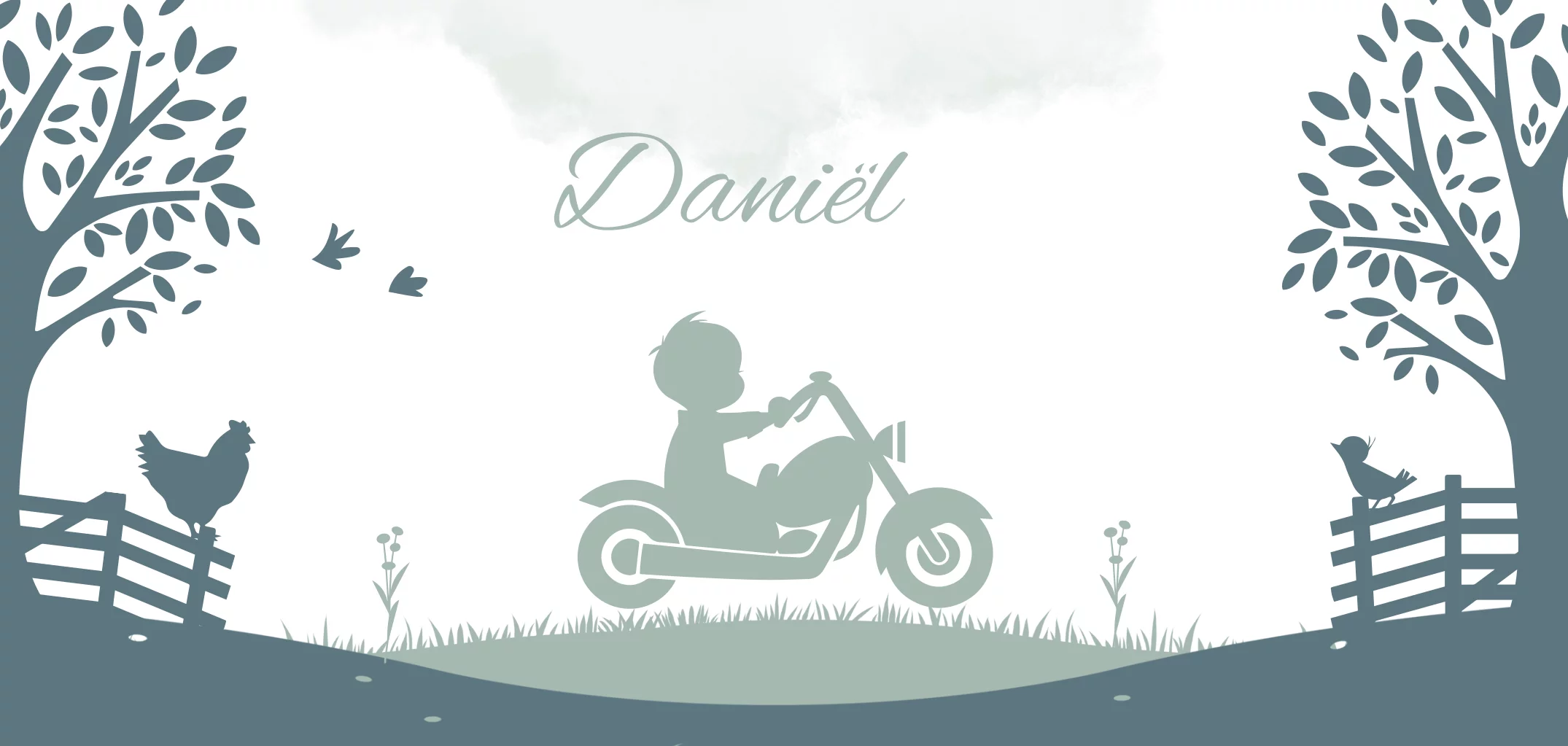 Stoer geboortekaartje met een jongetje dat op de motor door een groen landschap rijdt. Ook beschikbaar voor een meisje!