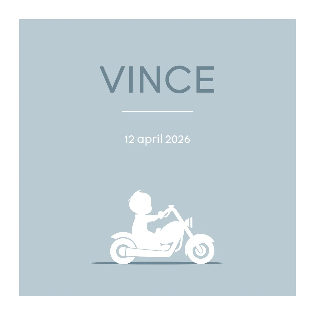 Stoer geboortekaartje met een jongetje dat op een motor zit.