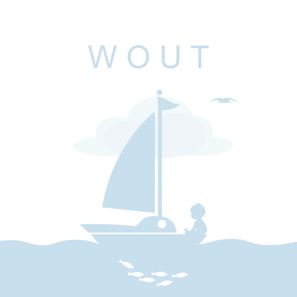 Geboortekaartje jongen in zeilboot, varend naar een vuurtoren op het strand in de verte.