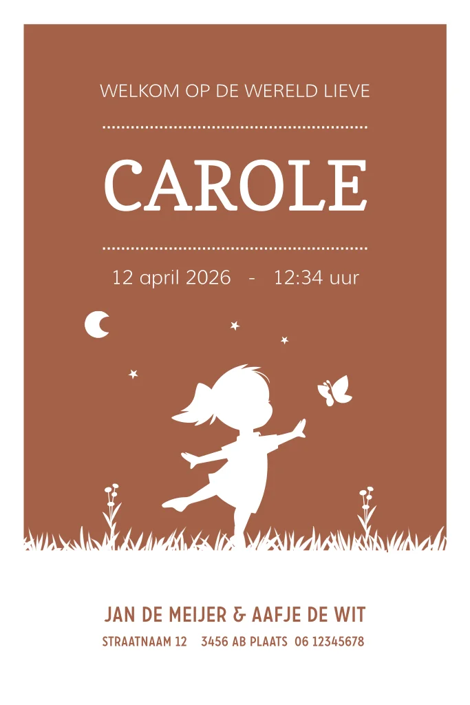 Geboortekaartje met het silhouet van een dansend meisje, vlinder, sterren en maan.
