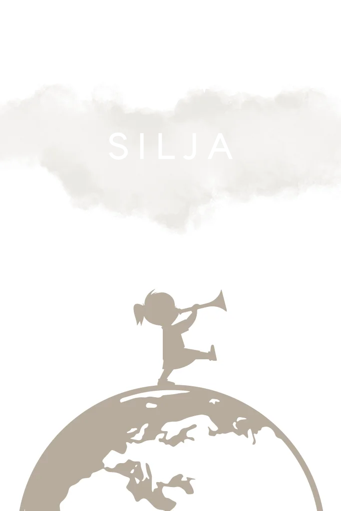 Geboortekaartje waarop je een meisje ziet dat met een trompet de wereld overloopt. Met mooie goudfolie elementen.