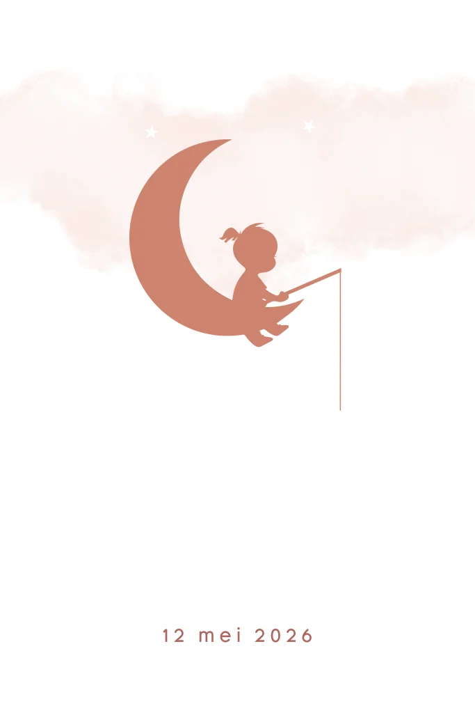 Geboortekaartje met goudfolie elementen waarop een meisje op de maan naar sterretjes zit te hengelen. ook beschikbaar voor een jongetje.
