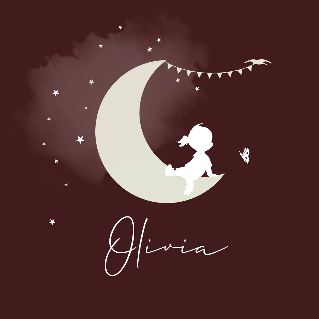 Goudfolie geboortekaartje met een meisje dat op de maan zit en naar een voorbijvliegend vlindertje kijkt.