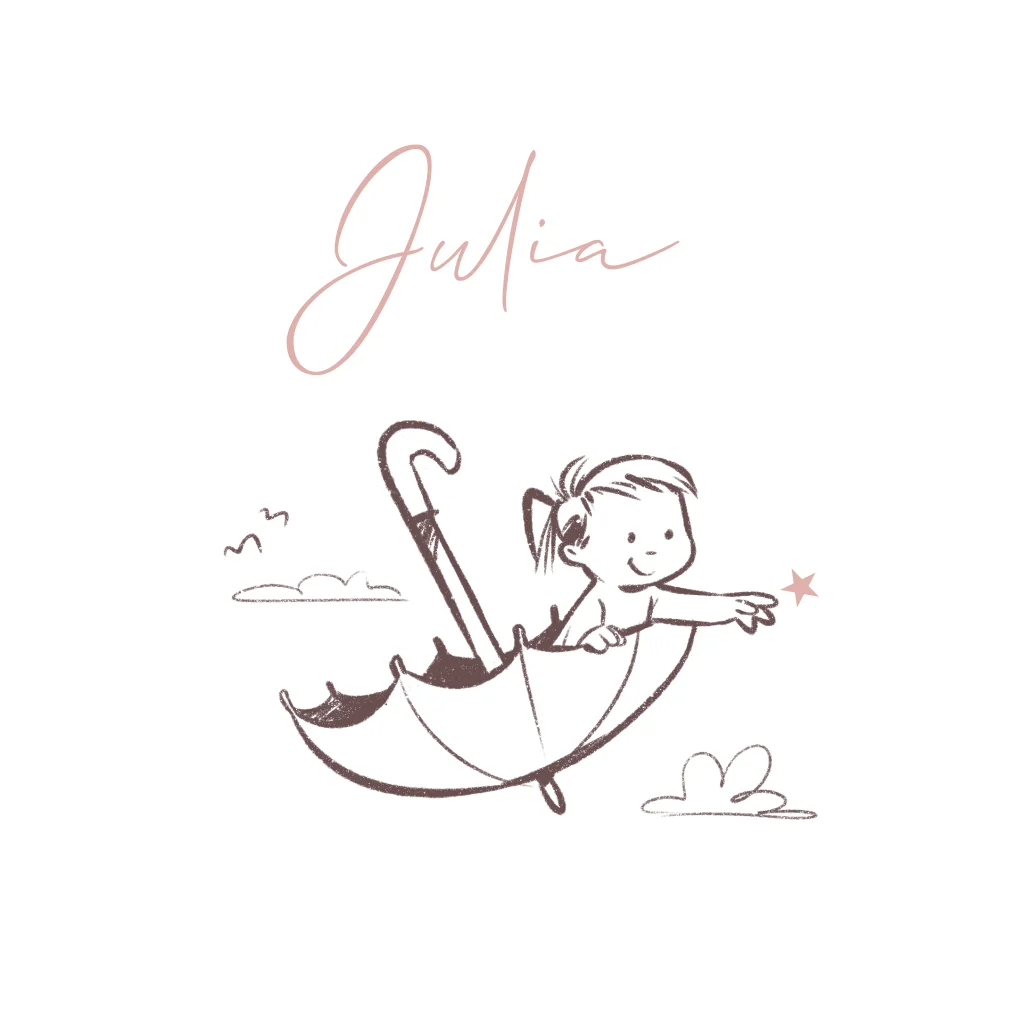 Dubbel geboortekaartje met afgeronde hoeken. Een meisje zweeft in een paraplu door de lucht en grijpt naar een sterretje.